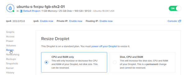 2. Disk, CPU, RAM –> This will increase the Disk space, RAM, CPU of the droplet and the changes are permanent it can’t be reversed.