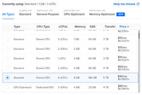Choose an appropriate plan to resize your droplet. Select the required one and then proceed with the resize option. Several plans are available for each droplet. CPU, RAM varies and also the price varies to plan.