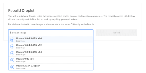 If you have lost the access to the droplet or you would like to switch the operating system versions, in such cases you can select the way of rebuilding the droplet option.