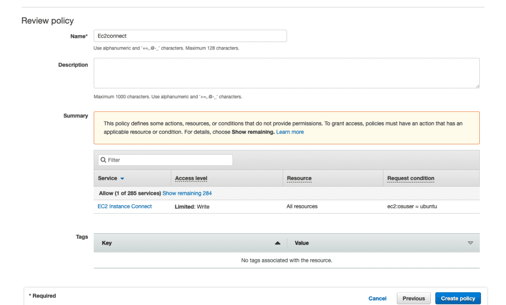 After that proceed with the “next tags”, it is an optional step if you need to add tags you can add them there. Next, you have to review the summary and give a name for the policy.