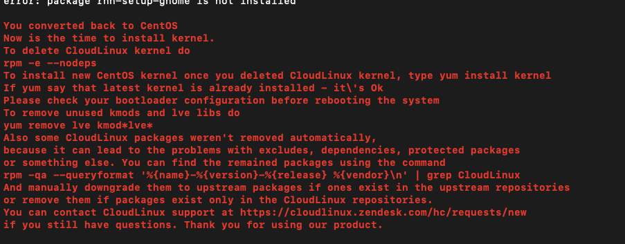 Once you removed the CloudLinux OS shared kernel, run this command to install a new kernel for CentOS.