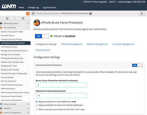 If you have locked down the SSH but still there are several other services bots might desire. The cpanel and the WHM include the cpHulk, a brute force protection tools that monitor the Cpanel, WHM, Mail, ssh ports. You can find the cPHulk in the WHM security centre. By default, if it is disabled, click on the switch and enable it and access the configuration interface.