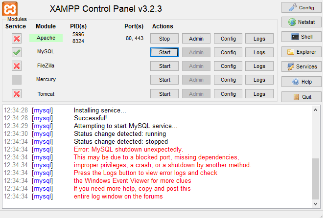If you are getting the MySQL shutdown unexpectedly error when starting the XAMPP control panel like below,